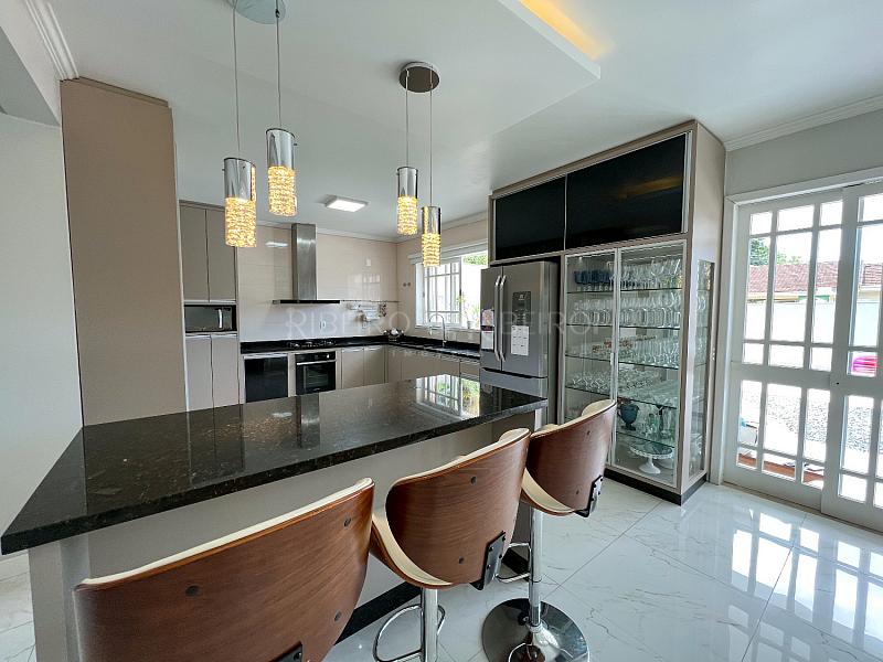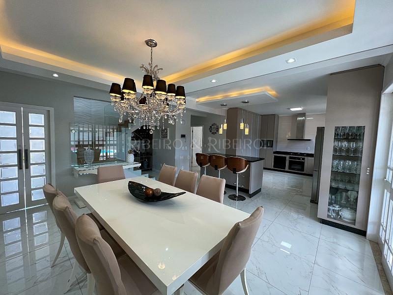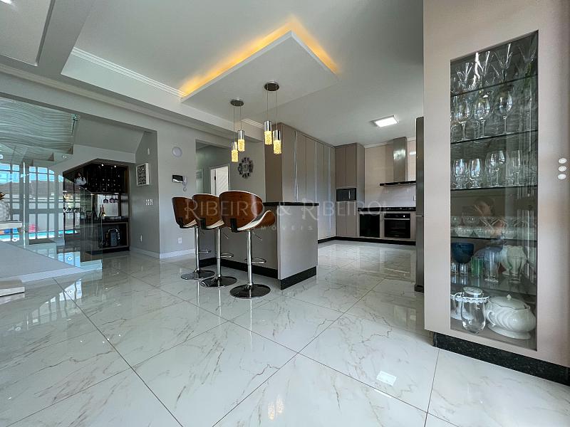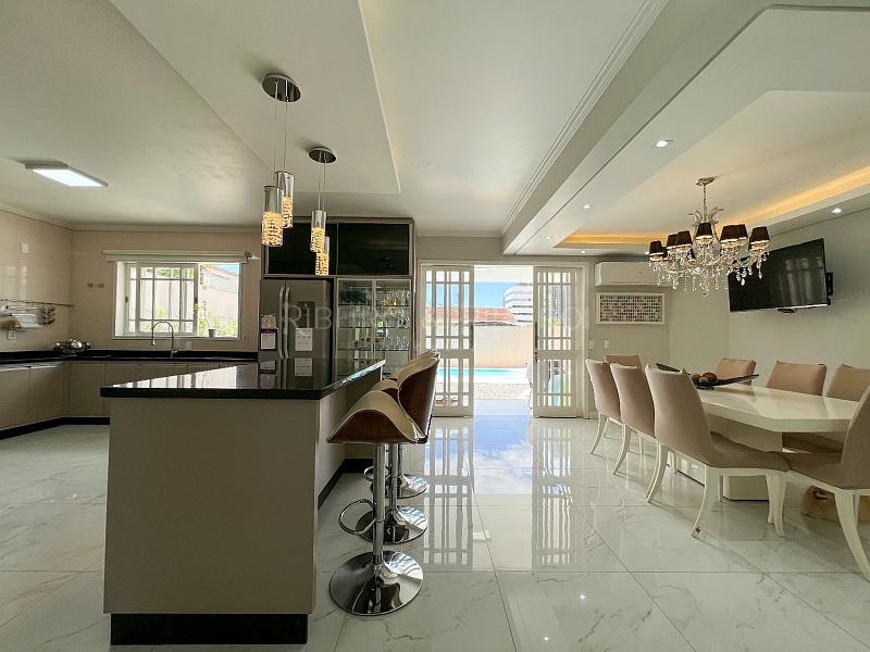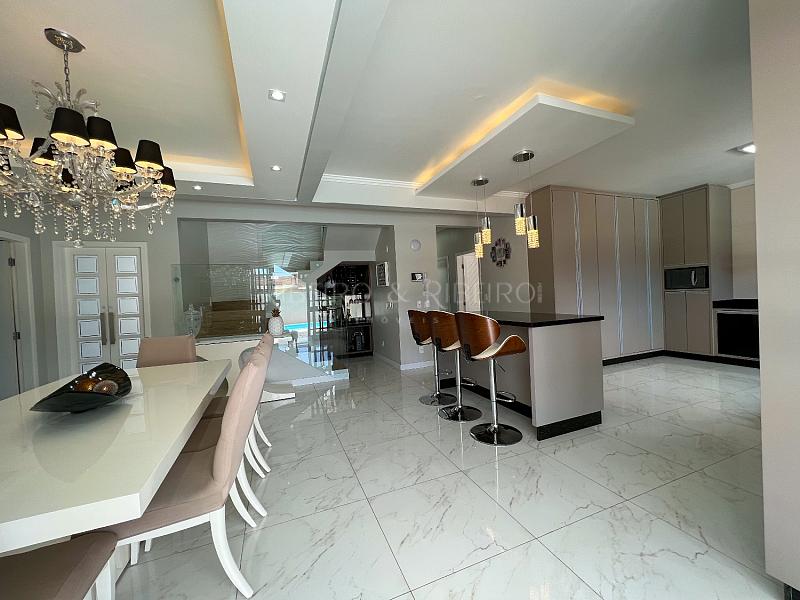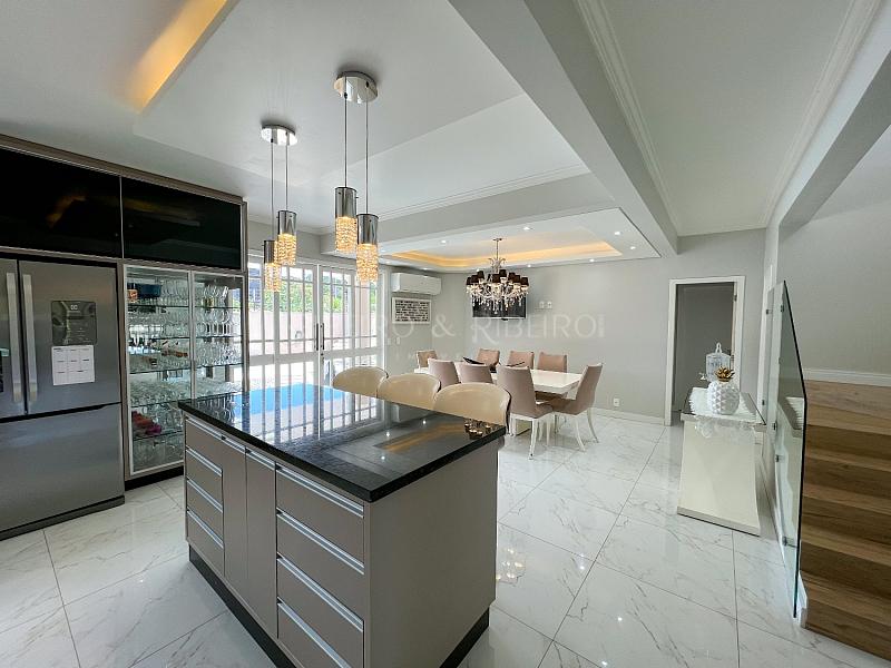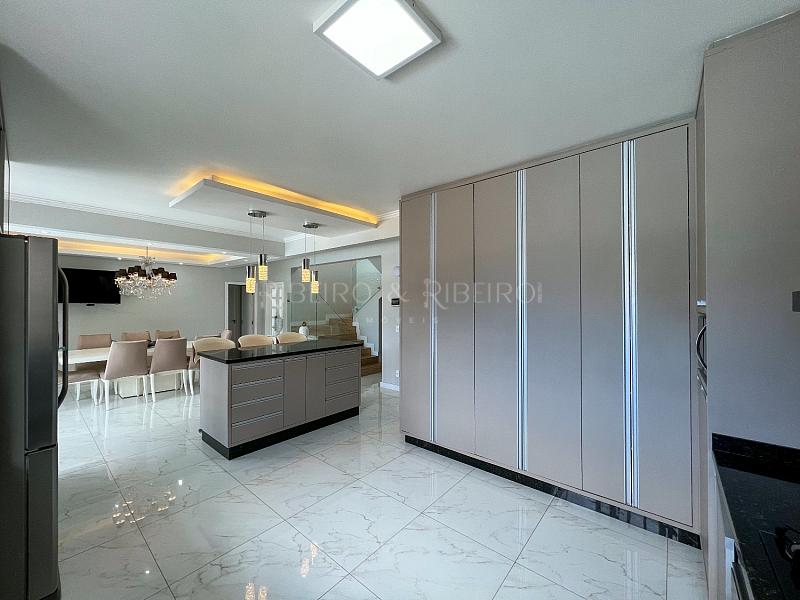 Na área interna da casa no piso inferior conta com uma cozinha grande integrada com a sala de jantar, sala íntima, sala de estar, lavanderia, lavabo, 01 suíte e mais 01 dormitório.