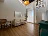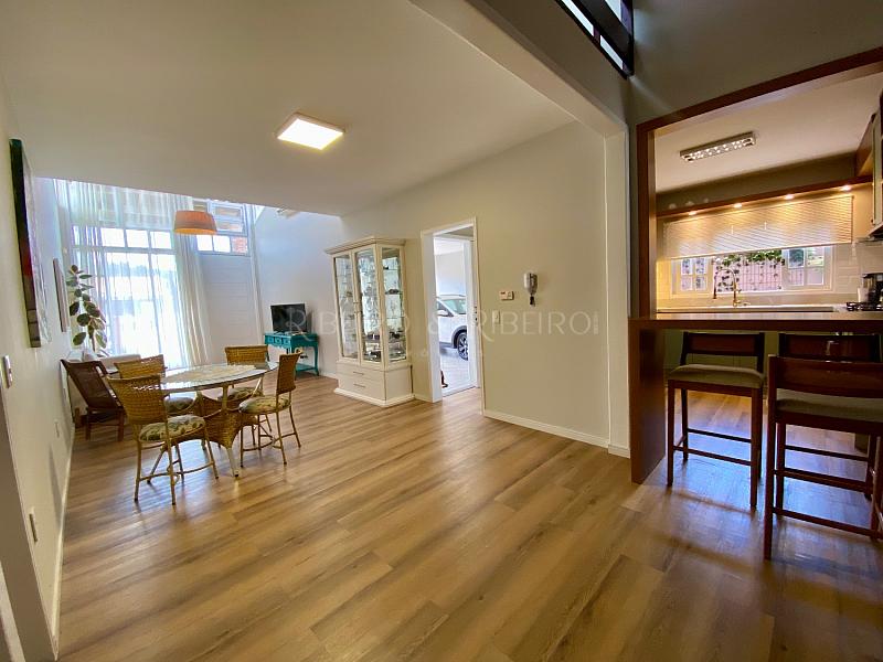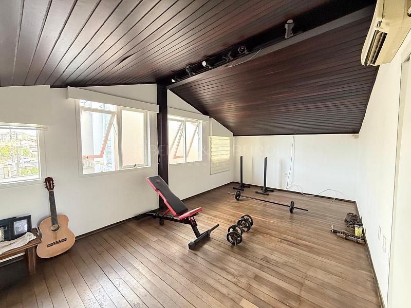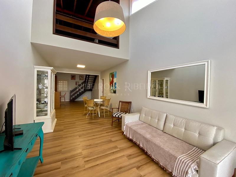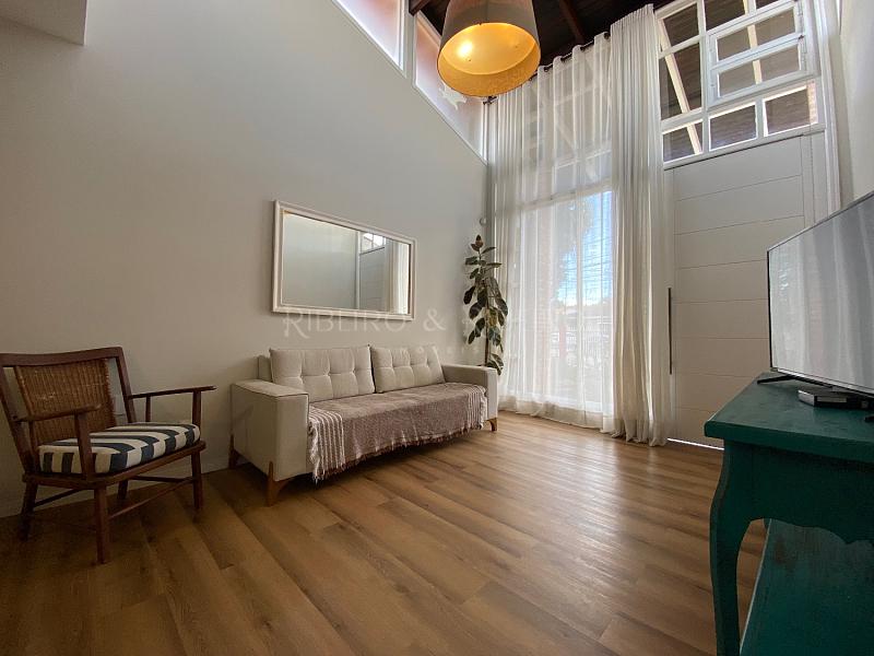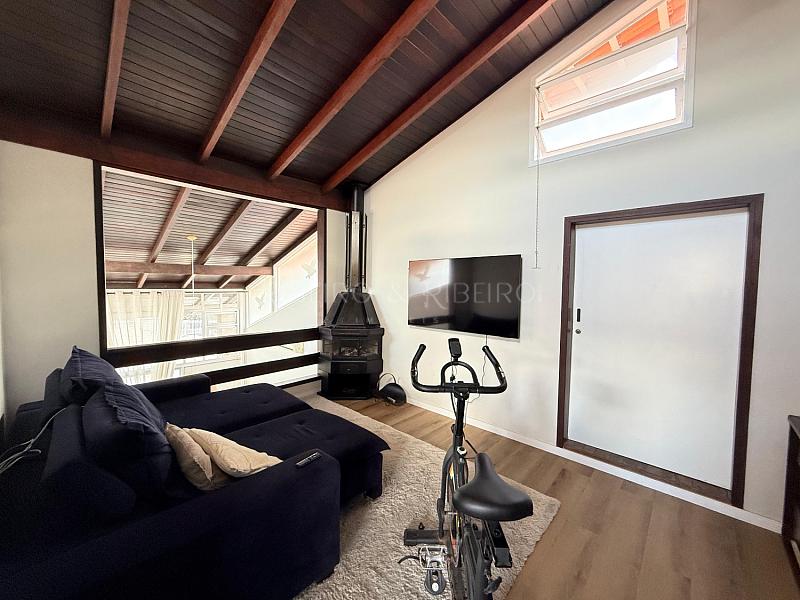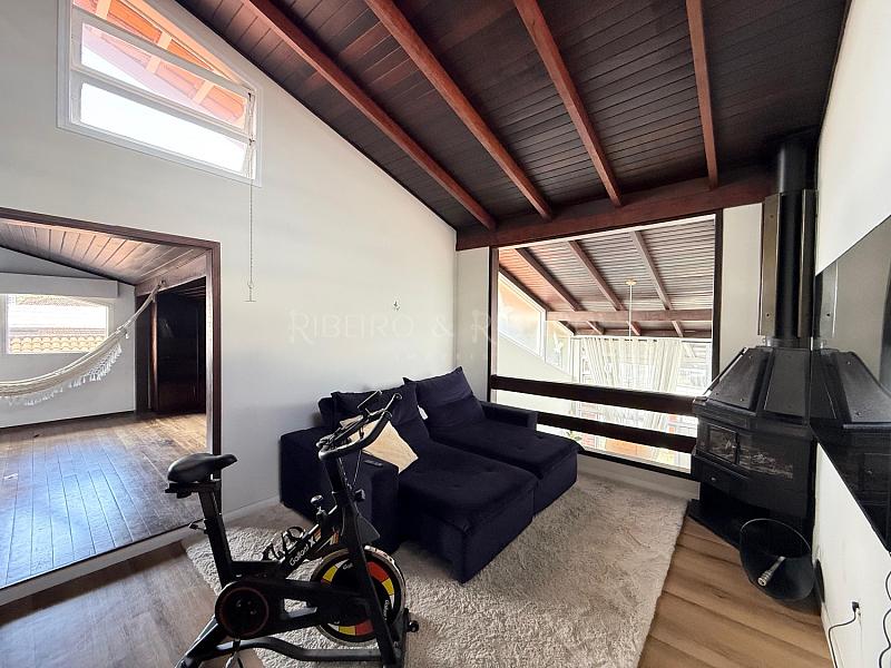 ambientes integrados de sala de televisão e de jantar com lavabo, cozinha no estilo americana com mobiliário sob medida novo e moderno, com mezanino com lareira e 02 quartos adicionais (um utilizado como academia e outro com home office ).
