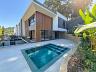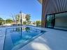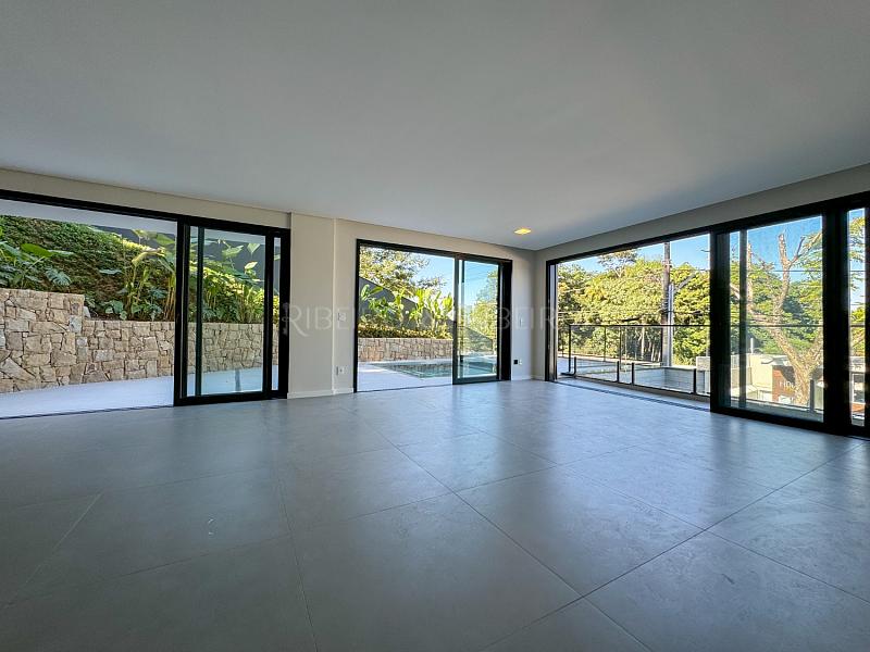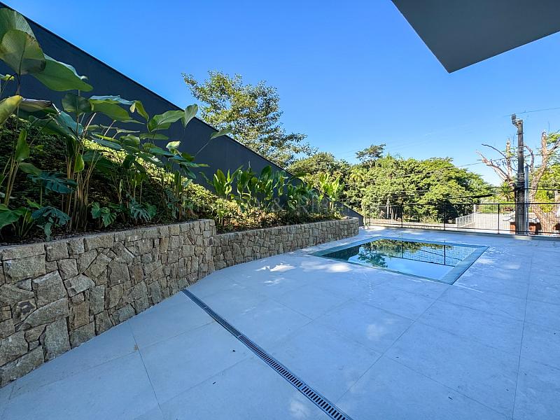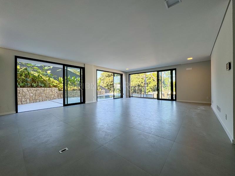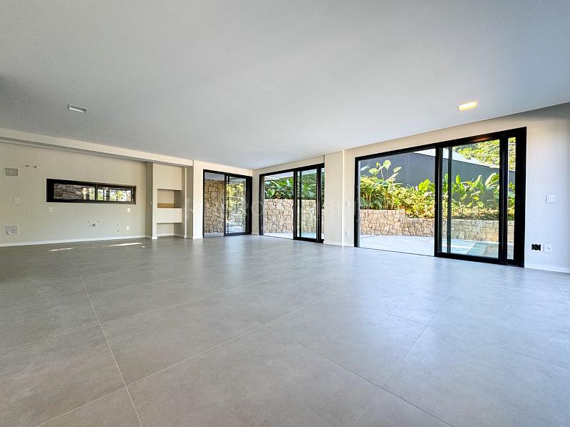Salas de estar/ jantar e cozinha gourmet integradas com churrasqueira à carvão, ao lado a área externa com piscina e um paisagismo lindo.